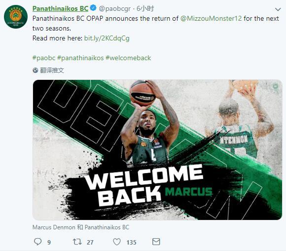希腊联赛豪门帕纳辛奈科斯宣布签回马库斯-邓蒙,未来两个赛季将回归效力。值得一提的是,希腊甲级联赛及欧冠联赛的赛程时间与CBA几乎一致,这也意味着邓蒙下赛季大概率不会出现在CBA赛场。