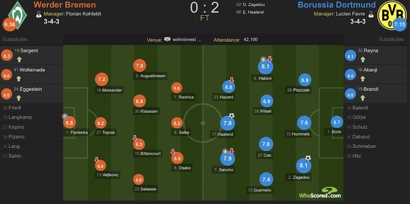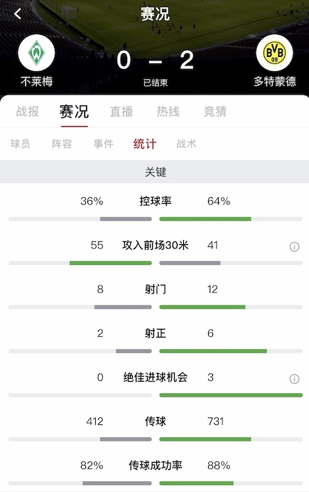 最终全场比赛结束,多特客场2-0战胜不莱梅。